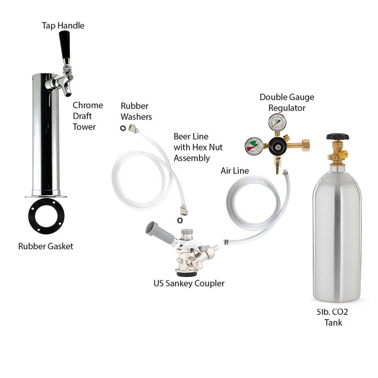 But thatโs not all. This convenient kit comes with everything else youโll need to set up your kegerator. That includes a 5 lb. aluminum CO2 tank (ships empty), a double-gauge CO2 regulator, and all lines and connectors.