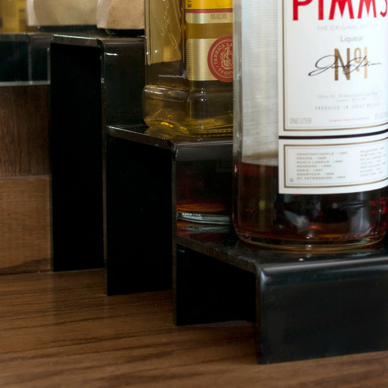 Bring some organization to your back bar with this 3 tiered liquor bottle display shelf. Made from durable black acrylic, these bar shelves will not bend or buckle, and are easy to clean. These shelves are exclusive to KegWorks and made in the USA.