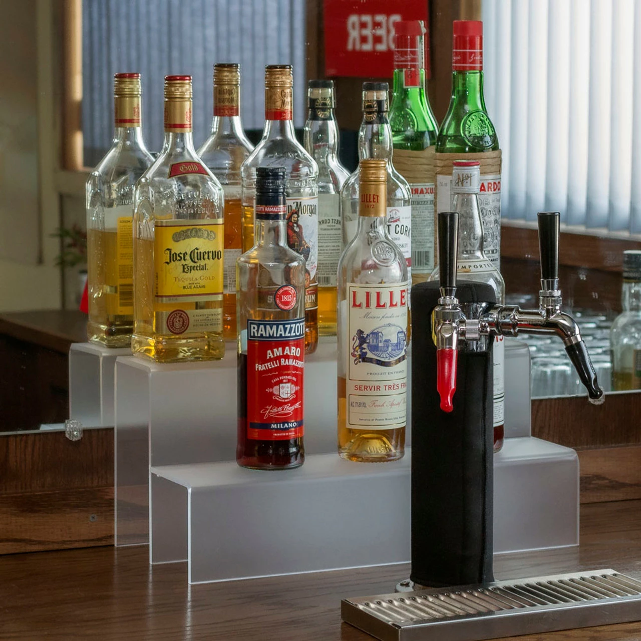 Bring some organization to your back bar with this 2 tiered liquor bottle display shelf. Made from durable translucent acrylic, these bar shelves will not bend or buckle, and are easy to clean. These shelves are exclusive to KegWorks and made in the USA.