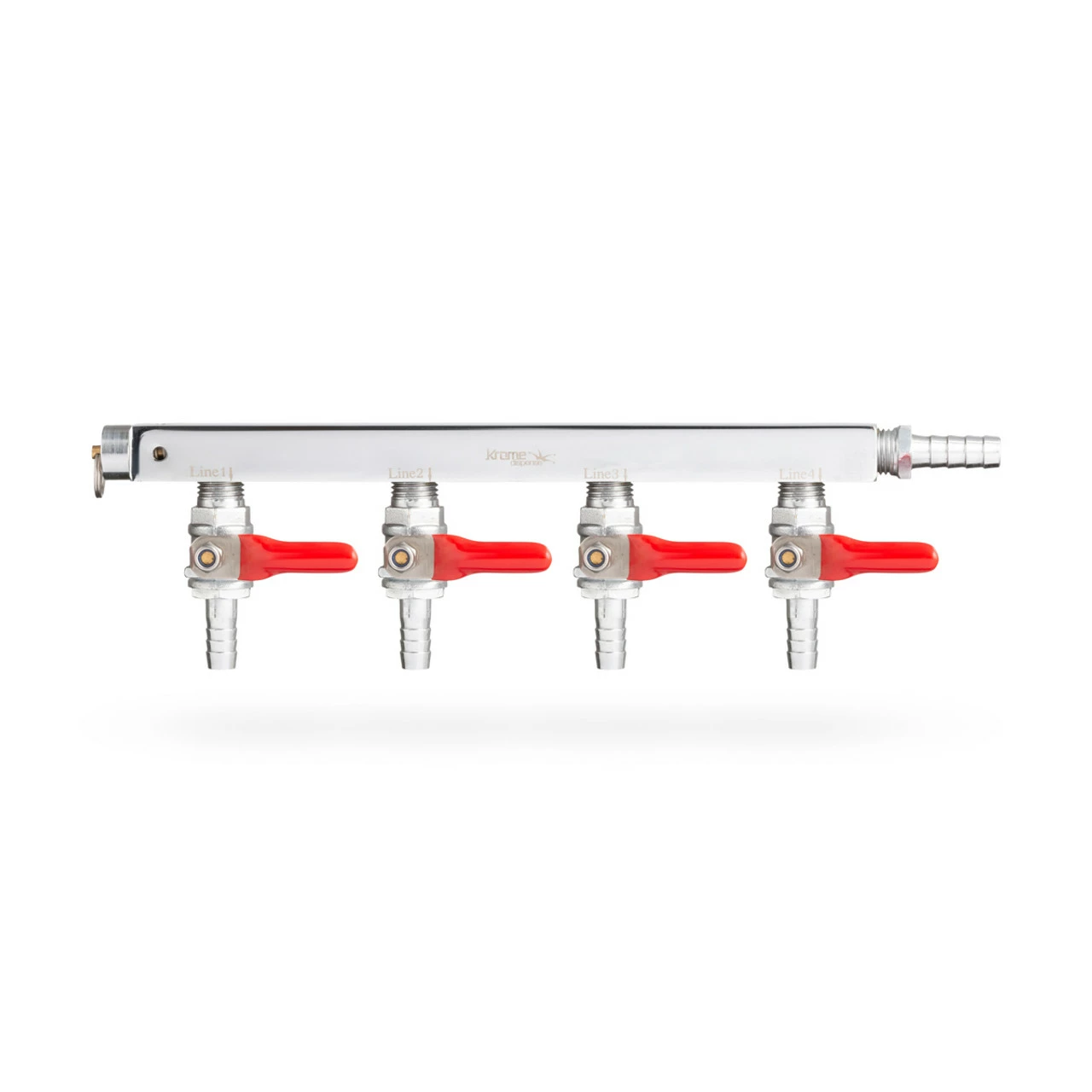 This distribution bar is used to distribute from one to 4 separate kegs. Each distributor has a shut off to turn off air distribution when not in use.
