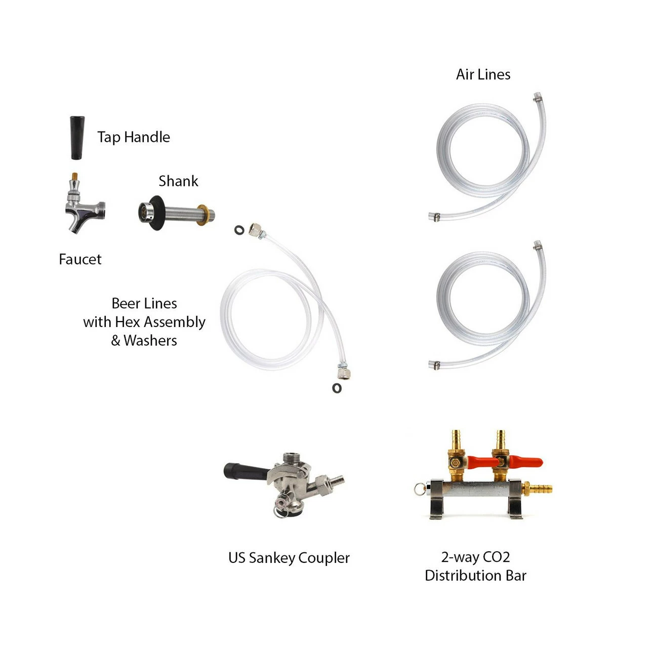 The beer line kit is very easy to install. Simply fit the included shank through the refrigerator door and connect your beer line and faucet. Attach the CO2 line from your regulator to the two-way CO2 distribution bar, then connect both air lines to the keg couplers.