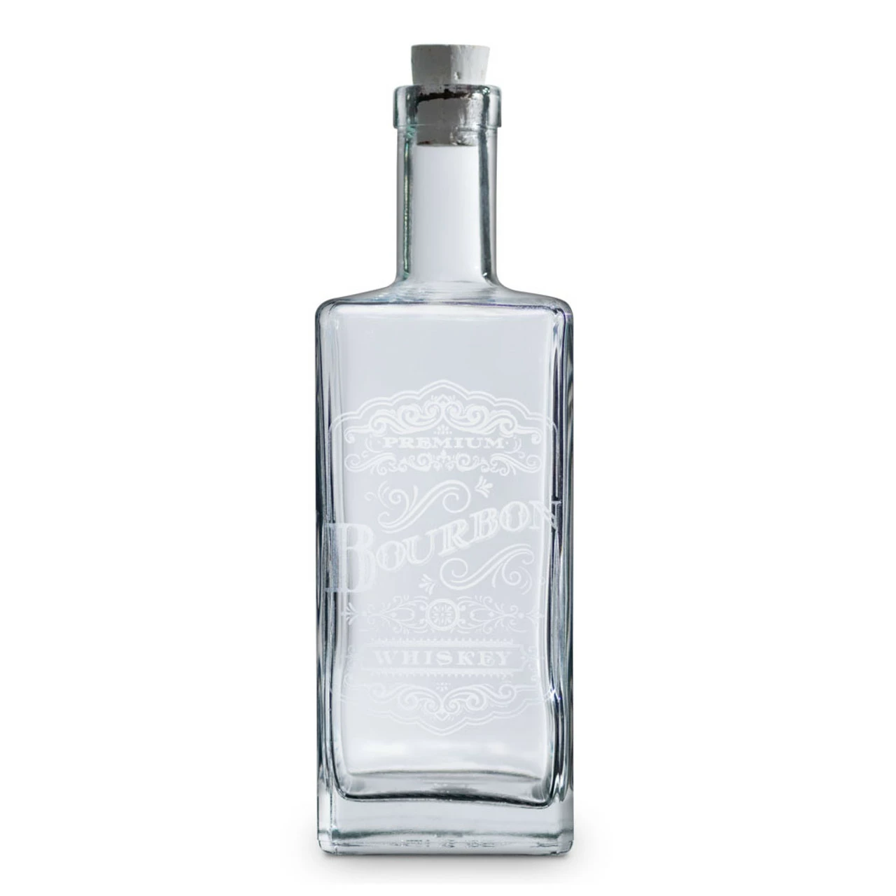 This glass bourbon decanter holds 750 mL and comes with a laboratory grade cork stopper to keep the contents from evaporating.