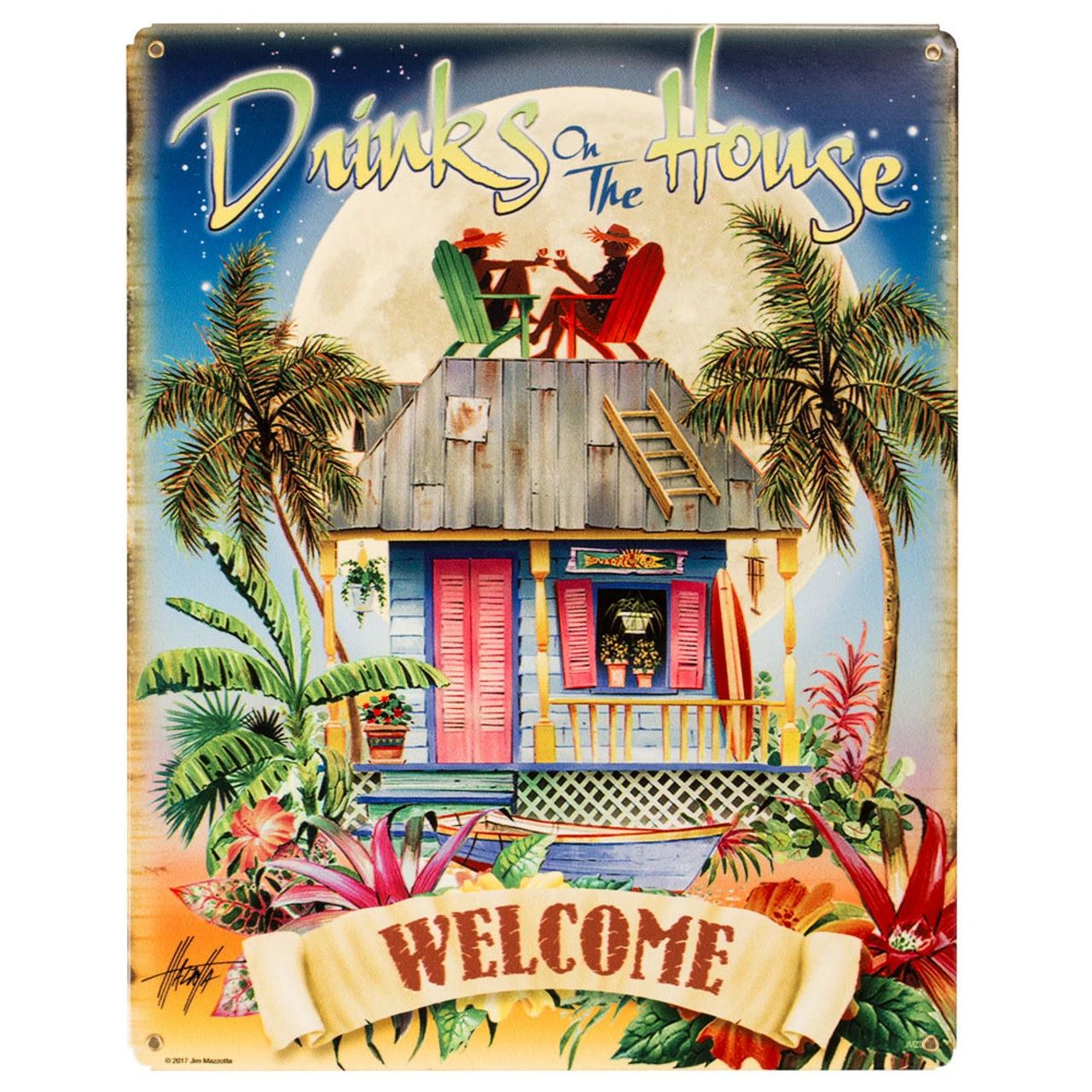 This 15″ x 12″ beer sign features the tagline “Drinks on the House” along with the drawn image of a beachwear-clad man and woman (who have clearly never heard of an idiom) drinking cocktails in Adirondack chairs perched on the top of their tropical oceanside cottage.