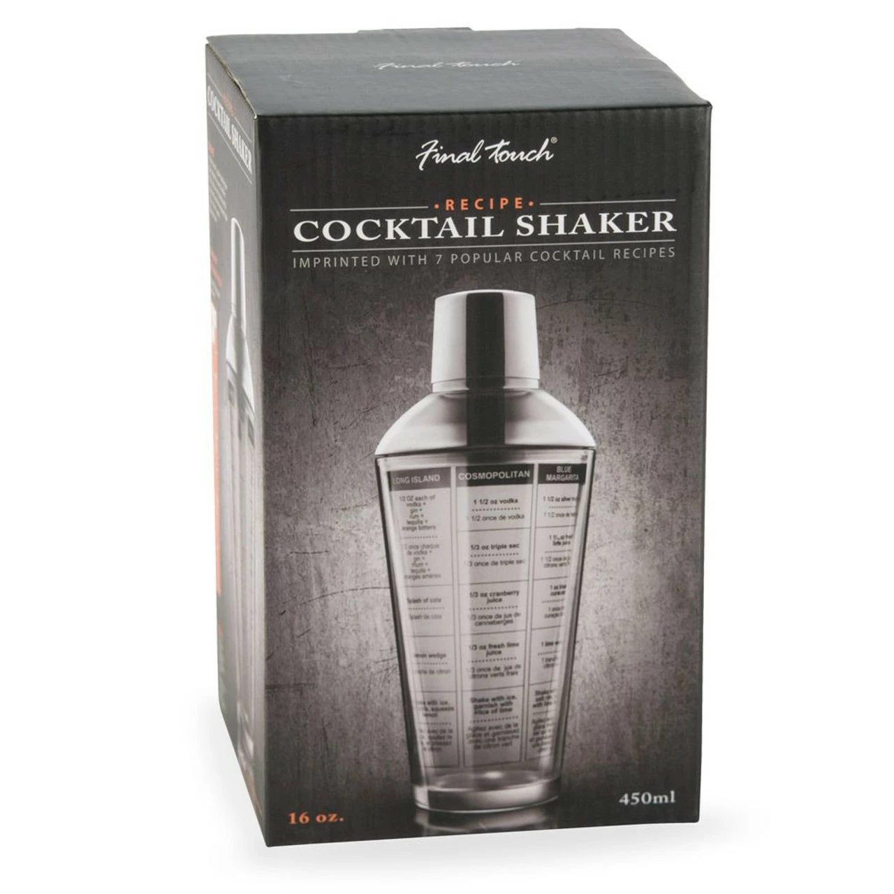 Imprinted with measurements in both ounces and millimeters and 7 popular cocktail recipes, including Long Island, Cosmopolitan, Blue Margarita, Mojito, Tequila Sunrise, Kamikaze, & Choco Martini.