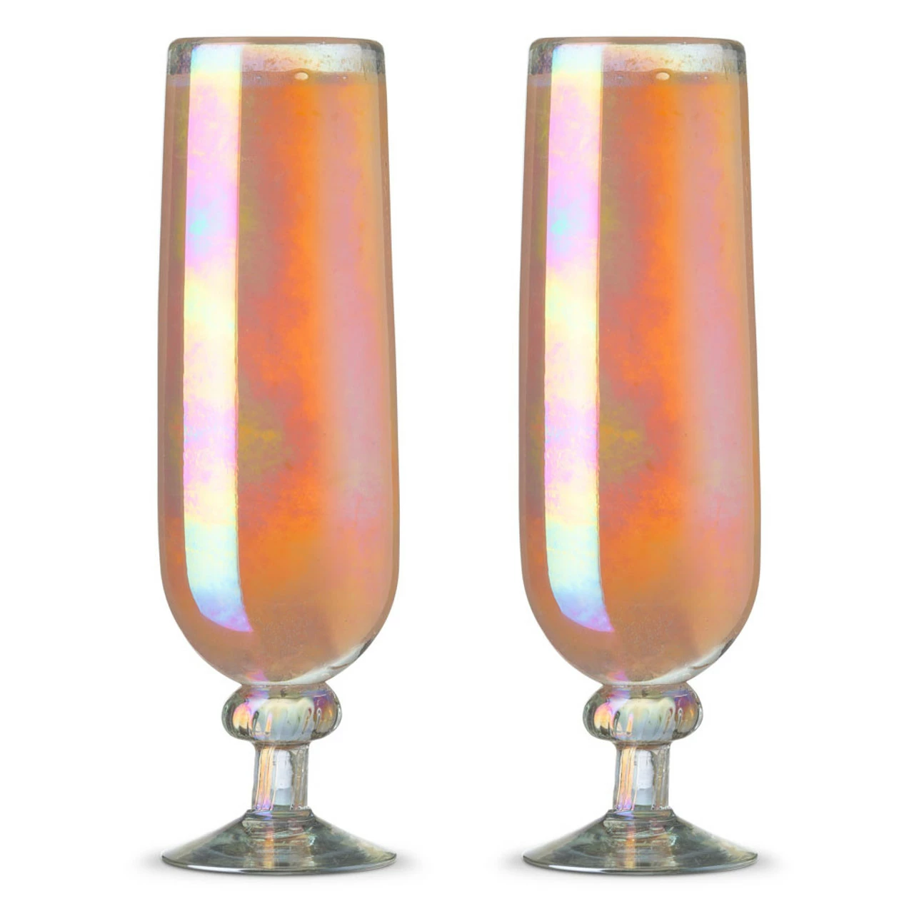 Made of hand-blown glass in Jaslisco, Mexico by master glassblowers these champagne flutes have ornate stems as part of their handcrafted appeal. As part of the process of making the champagne glasses, no two are exactly the same which gives you a true one-of-a-kind piece of artisan glassware.