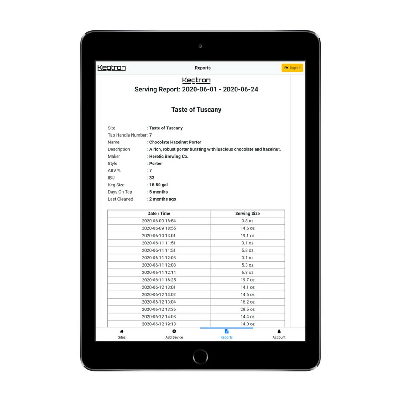 See your data from any PC or phone. Note: User must purchase Cloud subscription from Kegtron.