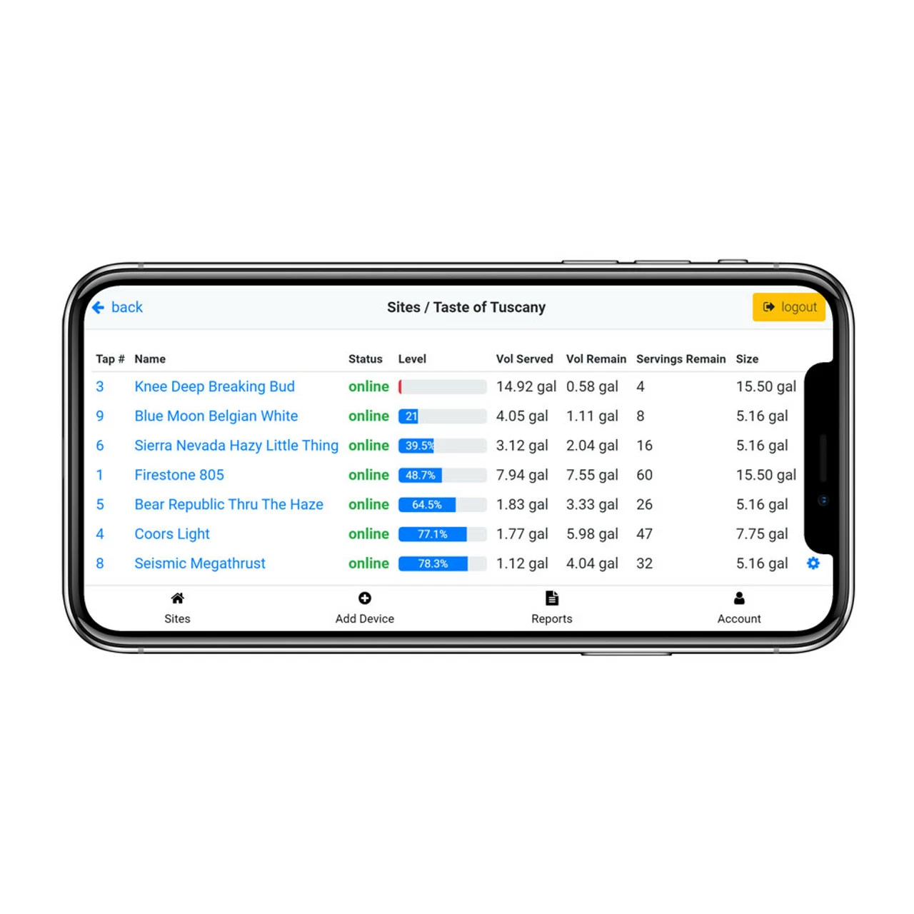 Instant, live inventory of all your kegs, no more lifting and guessing. From your PC, phone or tablet, all of your keg stats are just a click away. See live inventory levels, detailed usage reports, graphs and more. Data is accessible from any web browser and from any location, plus receive text and/or e-mail alerts when kegs are about to run out.