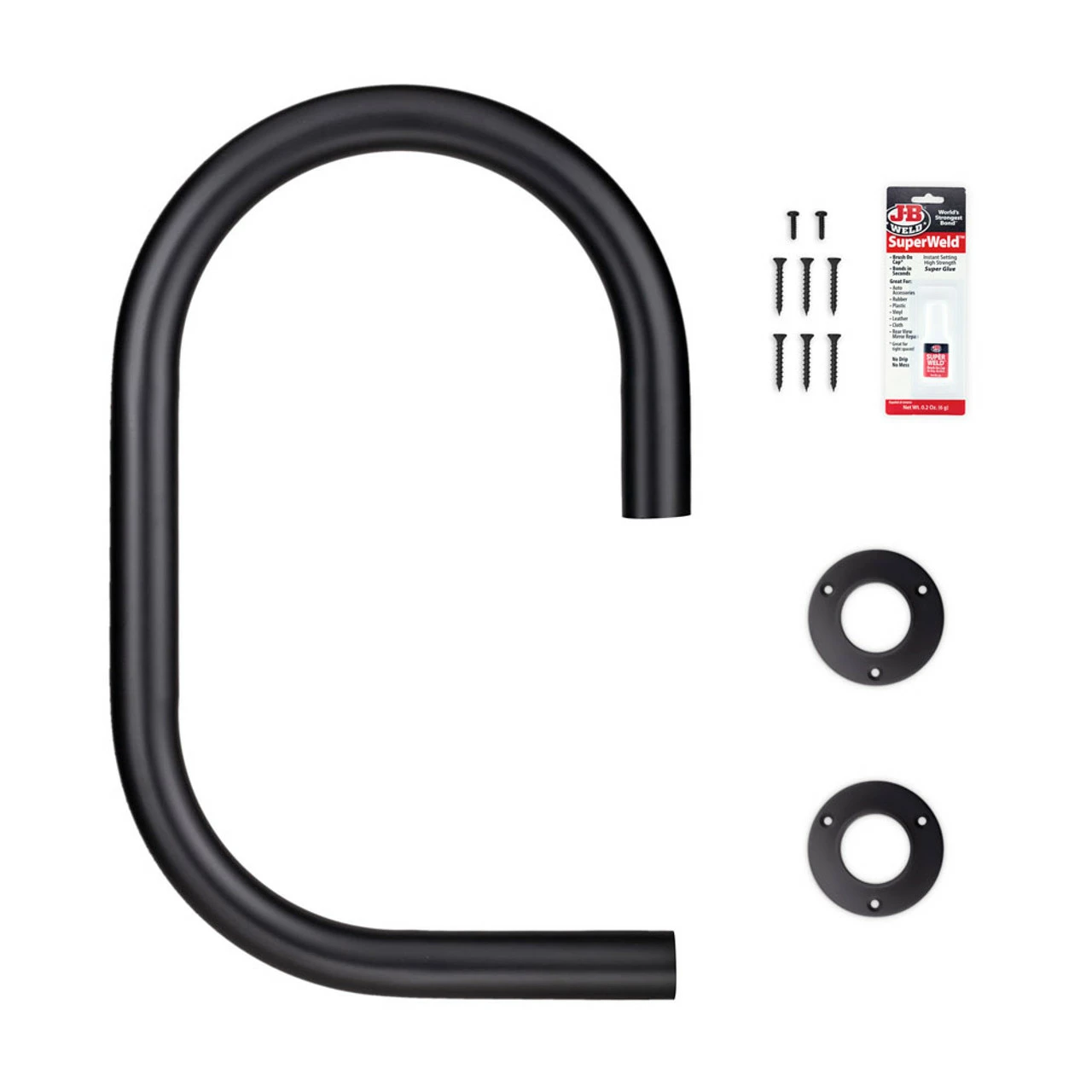 Bar service rail installation is easy and all parts and hardware pieces are included, with flanges for each connection to the bar, the 2″ outer diameter curved bar rail tubing, mounting hardware and JB Weld adhesive. This classic bar top rail attaches to the top of your bar and the floor.