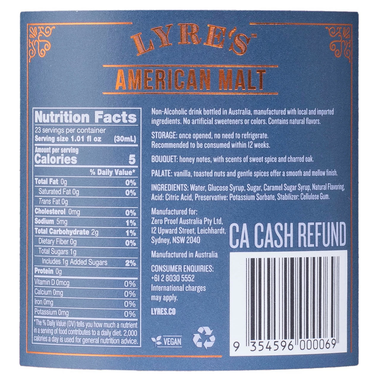 Lyre’s American Malt is a premium, non-alcoholic beverage that mimics the taste of bourbon whiskey. It has generous flavors of vanilla and toasted nuts with herbal notes providing a complexity, offset by a long mellow finish, the gently spiced palate results in the flavors remaining well after finishing. It features the same natural essences, extracts and distillates that match the aroma, taste and appearance you find within time tested classics.
