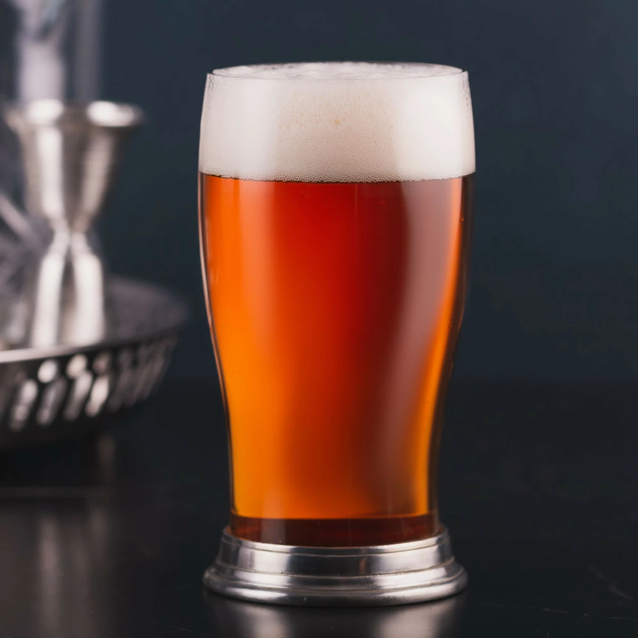 This sturdy and functional footed Imperial Pint glass holds 20 oz, which allows for a generous pour of your favorite craft beer with a sturdy head while the handcrafted pewter base ensures it will stay upright and sturdy on your bar or table.