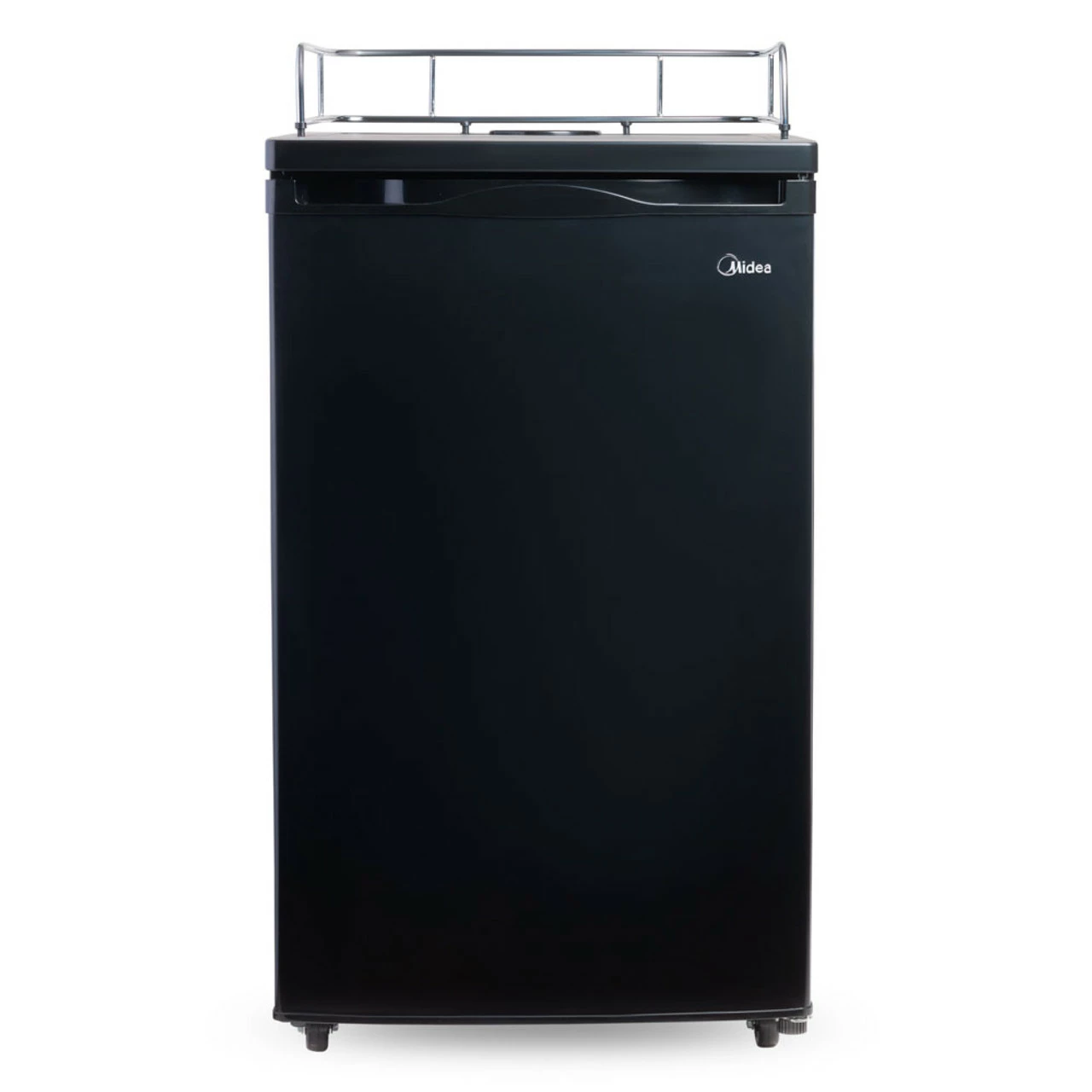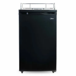 This kegerator fridge can hold either 2 sixtel kegs or 1 half keg. It includes brackets for mounting an air tank behind the fridge for increased storage, a dial thermostat, and adjustable shelves for adaptability as you build a kegerator to fit your needs.