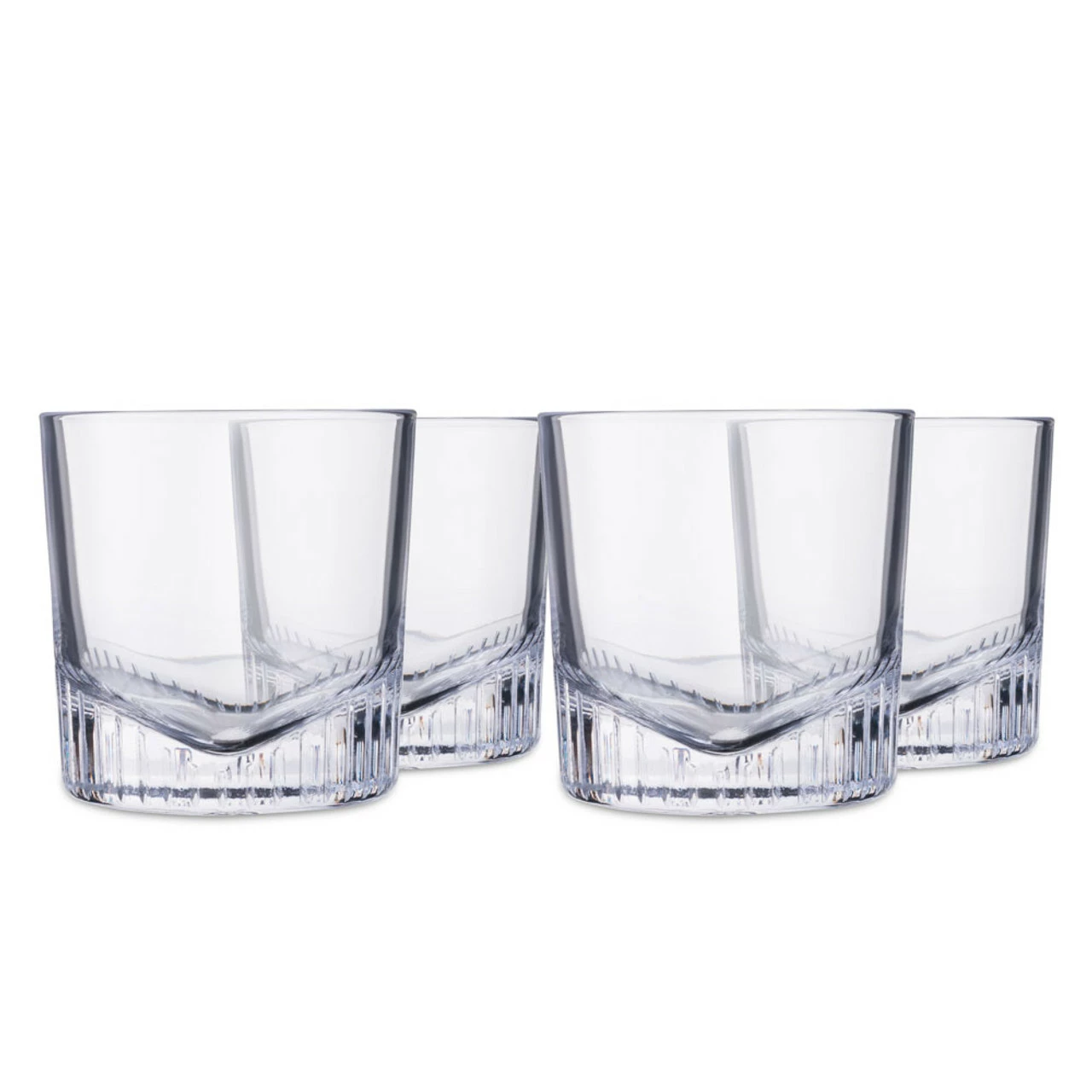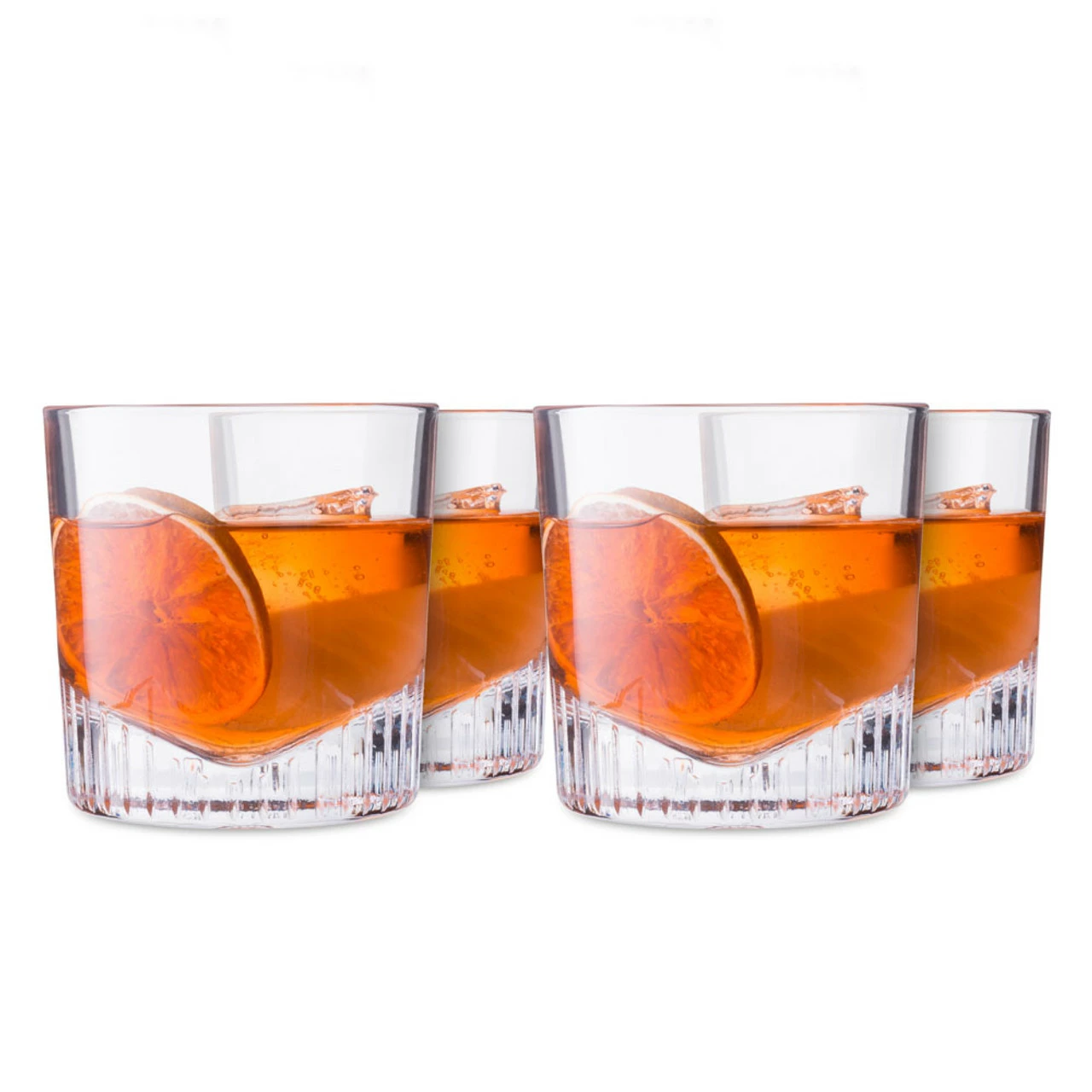 This set of four Nude Glass Caldera Crystal Rocks Glasses has an eye-catching design with a V-shaped base and striking vertical cuts around the base. The finished product is a double old-fashioned glass with a classic silhouette, but it grabs your attention when it’s filled with a cocktail or a dram of your favorite whiskey.