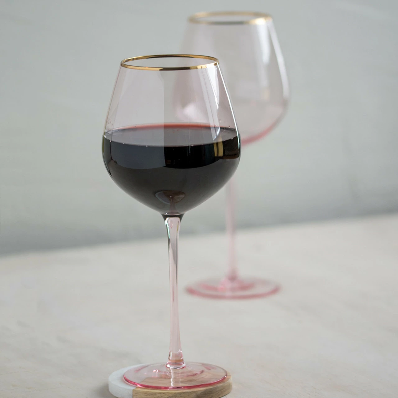 Add a little extra color to your wines with these rose-tinted crystal wine glasses. The tinted design with a touch of gold make them an excellent decorative piece to accent any home or commercial bar.