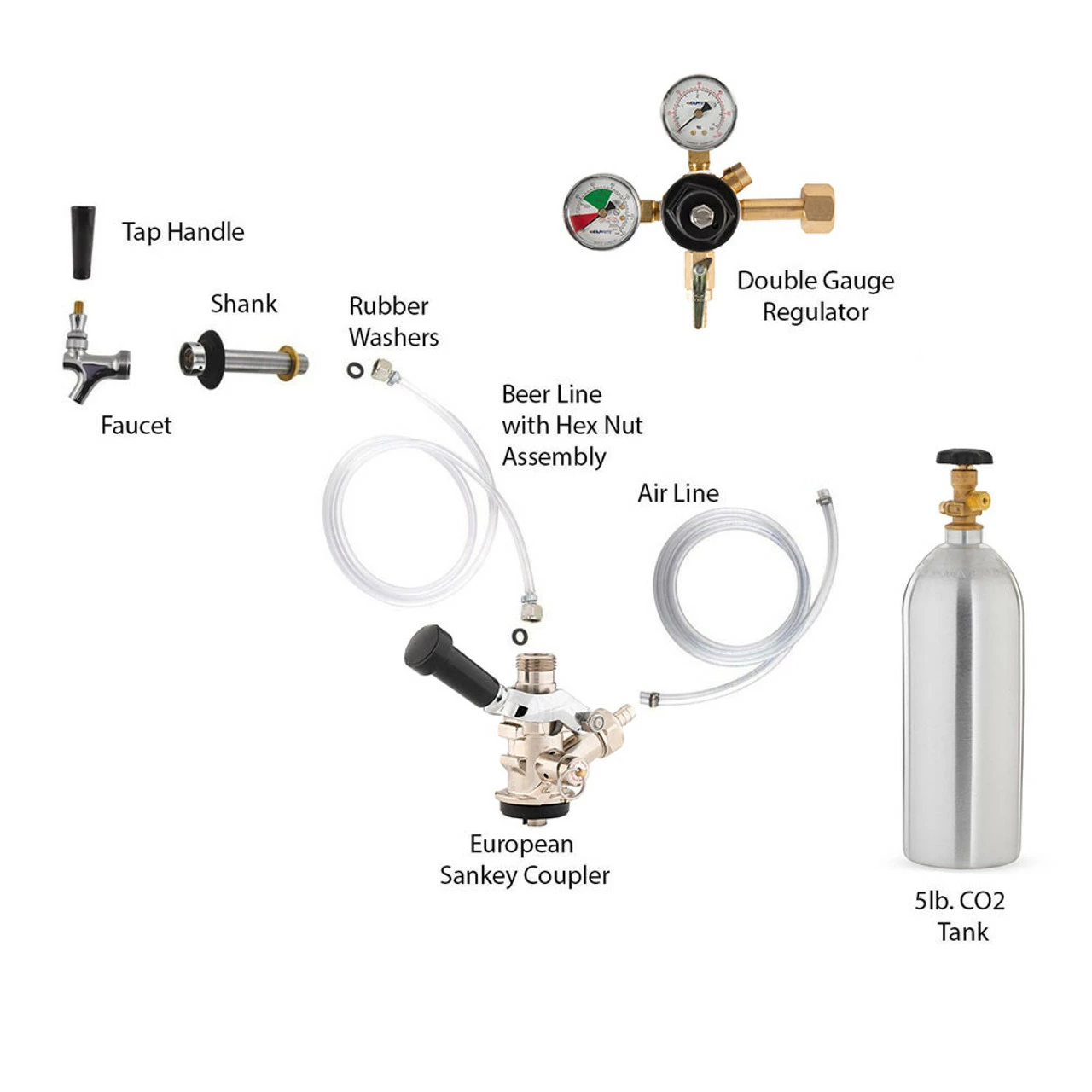 With this conversion kit, we’ve packaged virtually everything you need to build your kegerator, including a double-gauge CO2 regulator, a 5-lb CO2 air tank, a chrome faucet head with kob, a 5-inch shank, and all necessary lines and connectors. The only piece of equipment you’ll need to add is a (sold separately) and fill it at your local distributor.