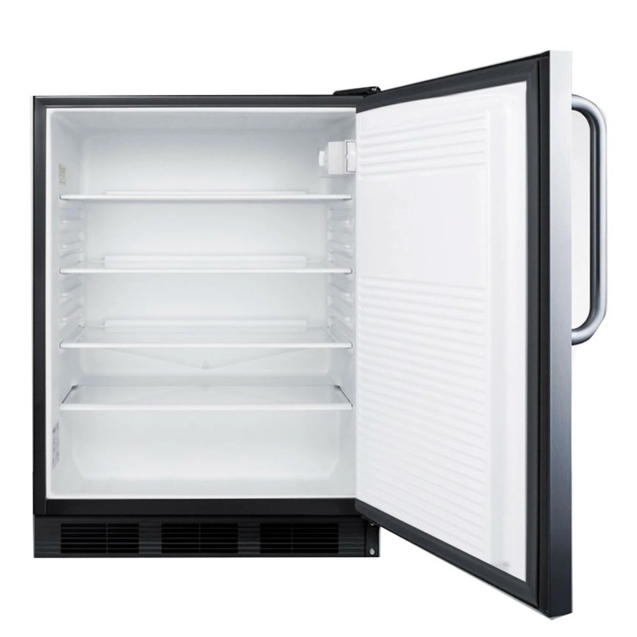 This all refrigerator includes a wrapped stainless steel door and a seamless stainless steel cabinet at an affordable price. It has Summit’s unique “hidden” evaporator to accommodate large trays, and a sturdy stainless steel handle. Solid construction.
