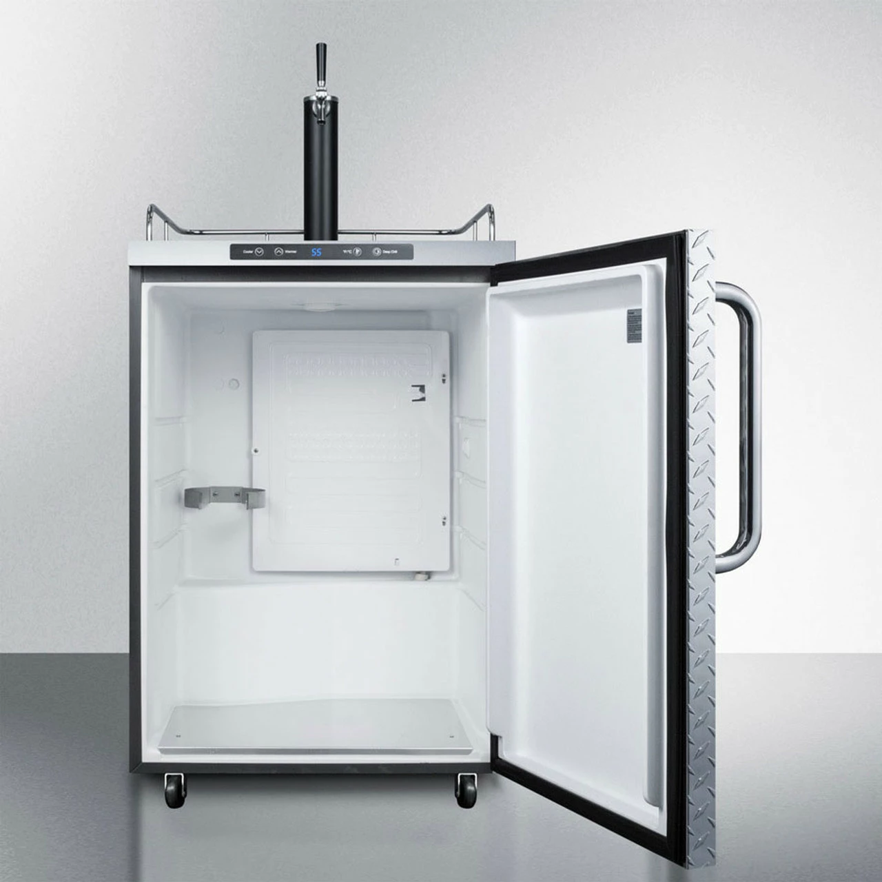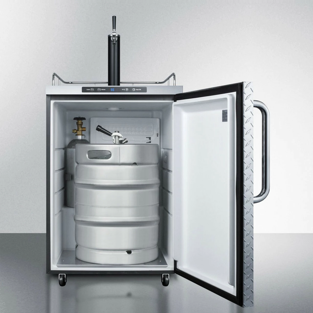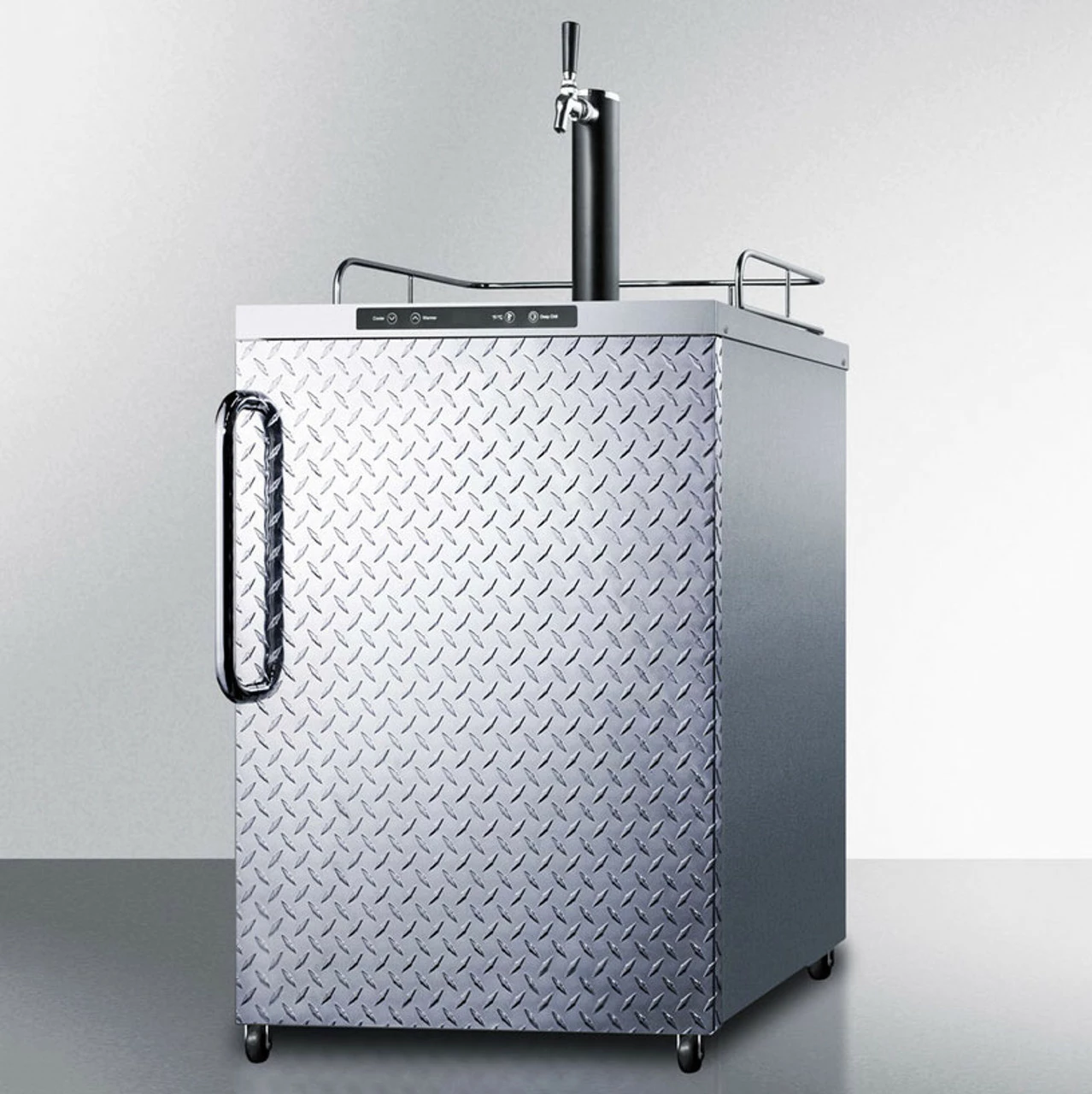 This striking kegerator features a stainless steel exterior with a rugged-looking diamond plate door. Durable and weather-resistant, this kegerator helps you enjoy draft beer in any outdoor setting. The cabinet offers a capacity to hold one 1/2 or 1/4 barrel keg, or two 1/6 barrel kegs if you choose to upgrade to a second faucet.