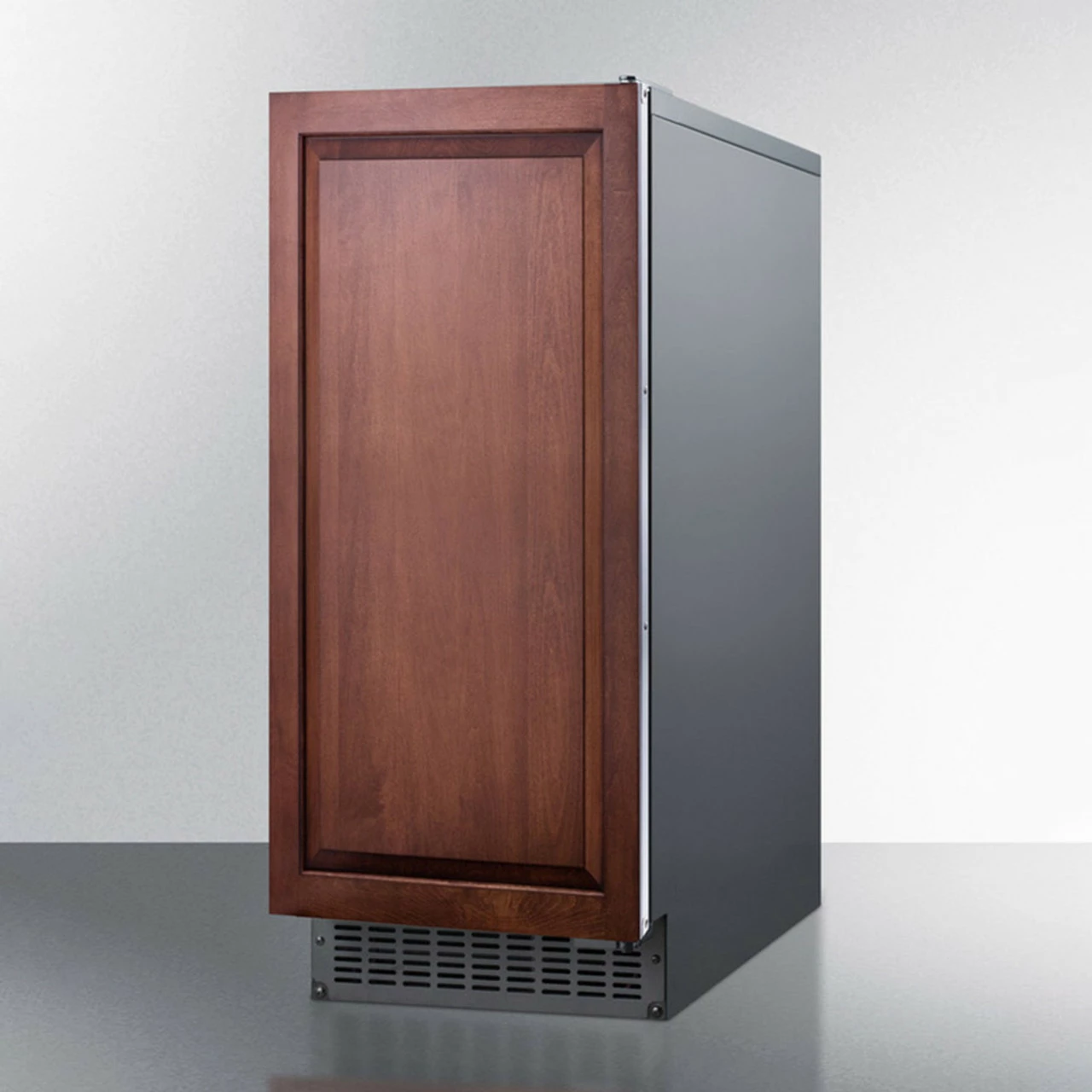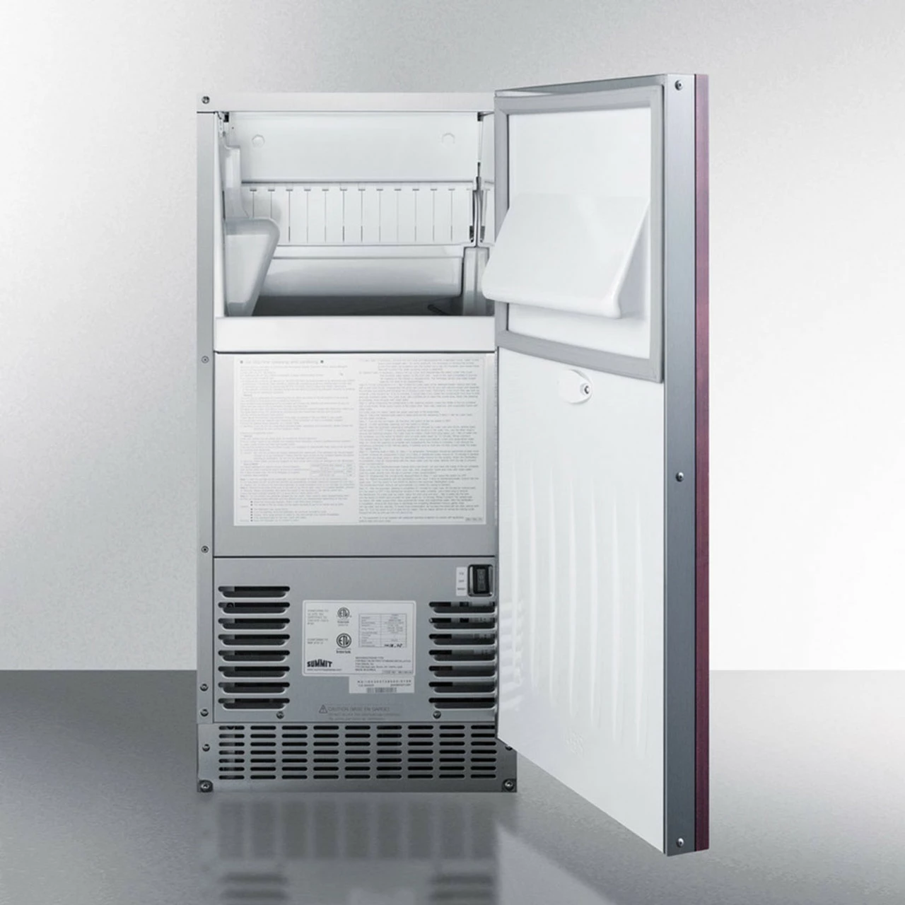 Featuring a sturdy stainless steel cabinet and a weatherproof design, this icemaker can be installed either inside your home bar or it can be used outdoors bars and patios. It measures 15″ wide with an integrated stainless steel frame that works with overplay panel to match your existing cabinetry. (panel size: 29 9/16″ H x 14 7/8″ W at 3/4″ thick) This unit features a front-breathing cooling system and fully finished sides so that it can be used as a freestanding ice maker or it has the capability to be built under counter. This model utilizes a gravity drain system.