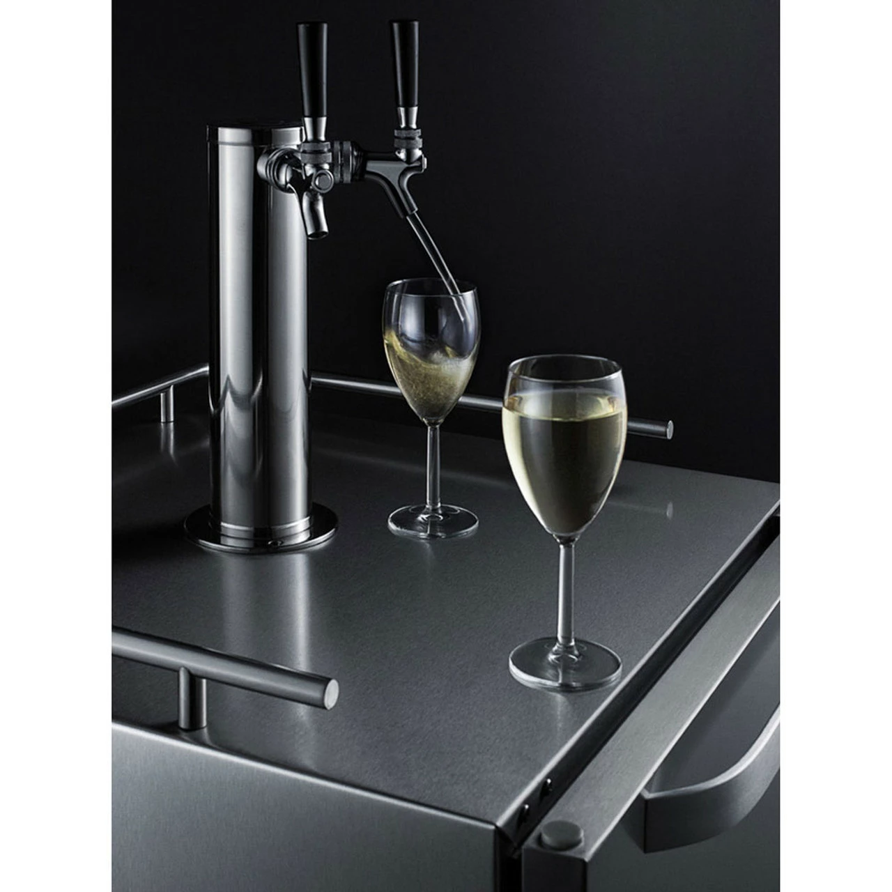 This dual tap kegerator includes a tap tower and two standard faucets. Each of these components are stainless-steel finished. If you’re serving draft wine, all stainless-steel contact is truly your only option. With a different finish, the acidity of wine on tap would corrode the materials of your system, and you would be drinking harmful chemicals over time. Stainless-steel will never corrode.