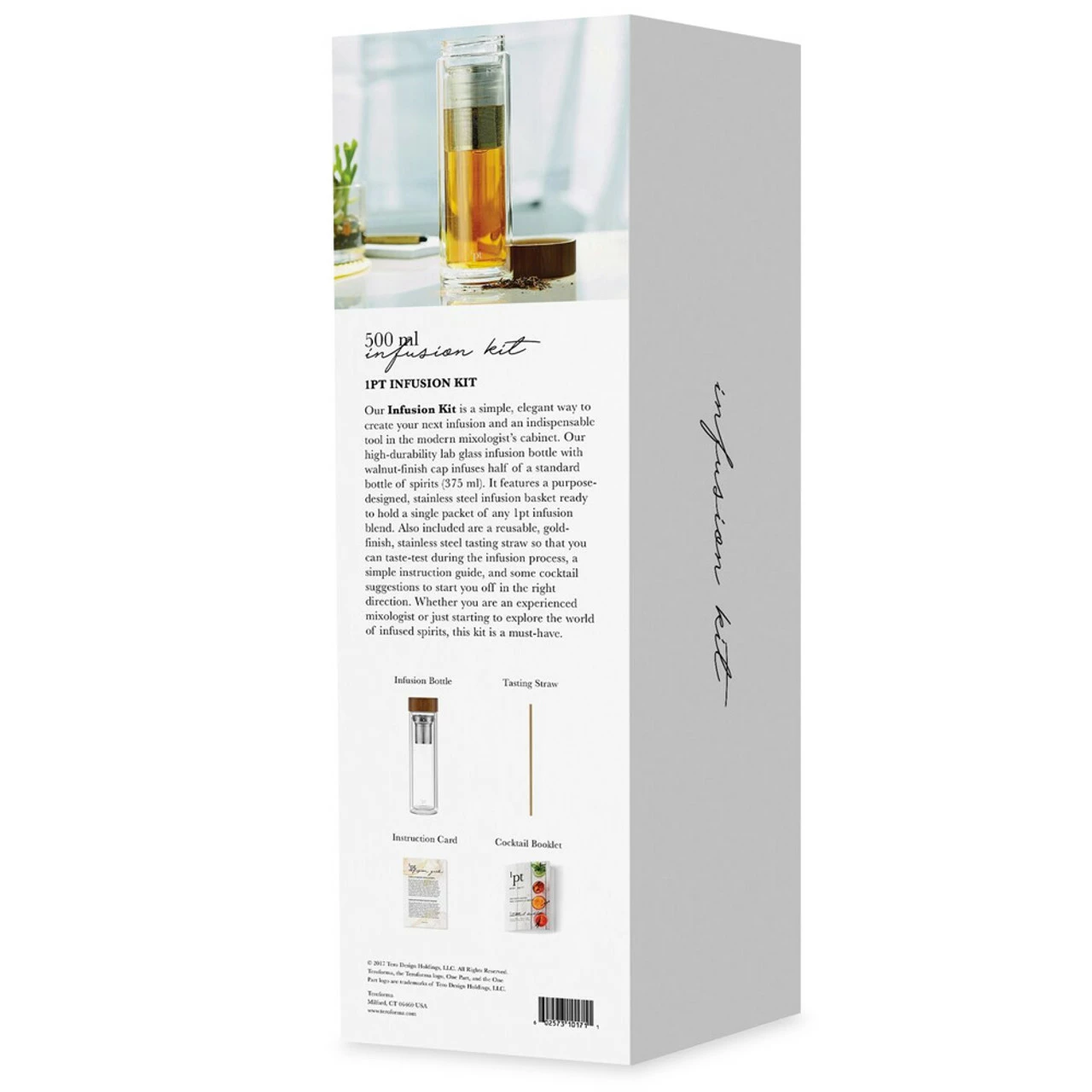 The Teroforma premium infusion set comes with a high-durability lab glass infusion bottle with walnut-finish cap that is capable of holding 375 ml of liquid (half of a standard bottle of spirits). Inside the bottle sits a stainless steel infusion basket ready to hold a single packet of any 1pt infusion blend.