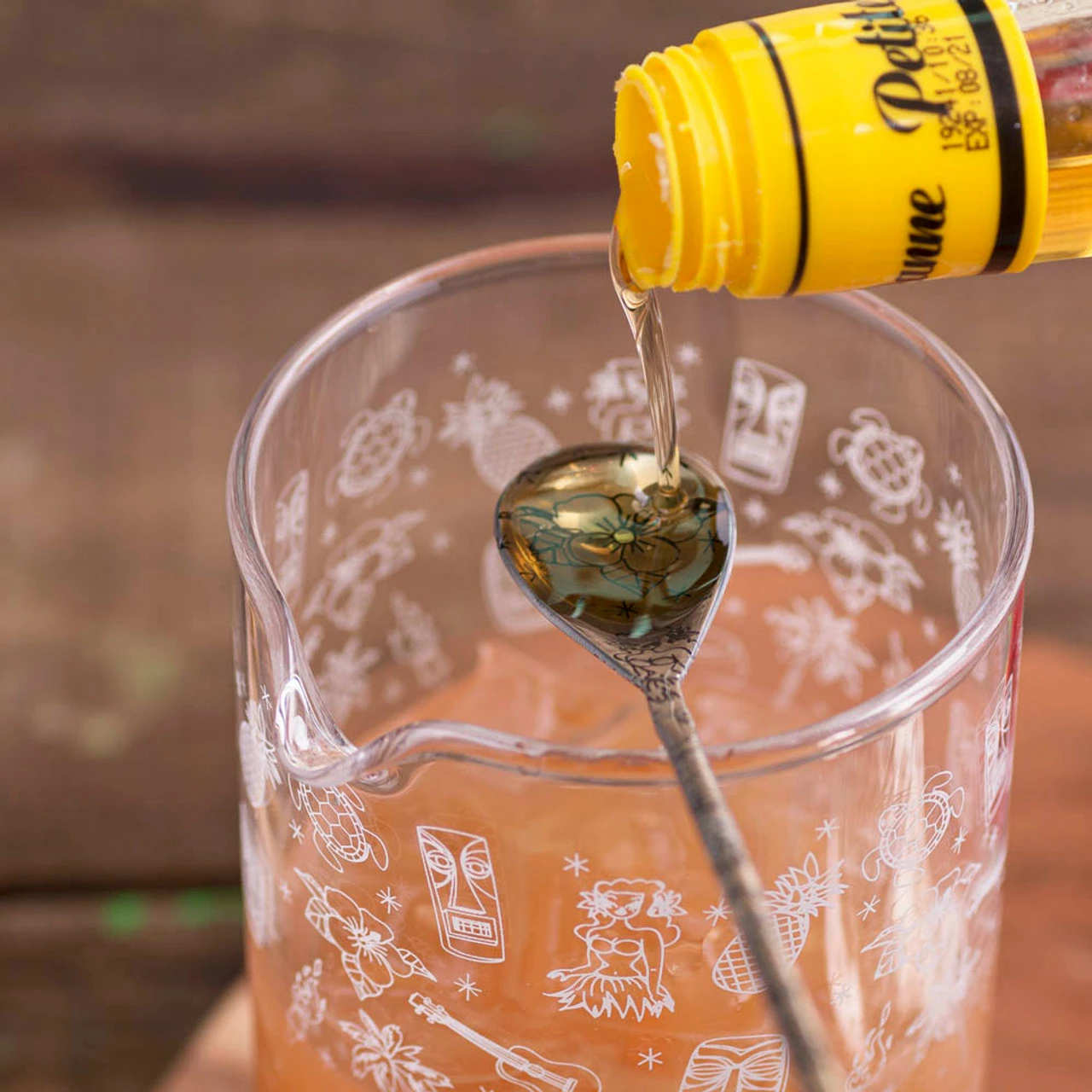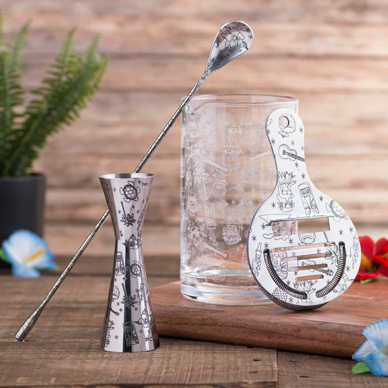 We’ve put together this handy little bar tool kit from ‘s line of tiki patterned bar accessories. You get the basic bar tools that are perfect for mixing up your favorite tropical concoctions, including a cocktail mixing glass, strainer, bar spoon and double-sided jigger. All four pieces in the Urban Bar Tiki Pattern Bar Tool Set are adorned with an eye-catching array of etched tiki graphics.Â