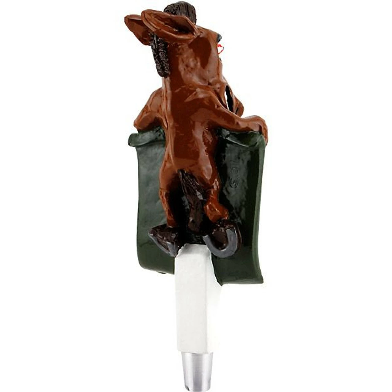 This bar tap handle features a sculpture of an intense-looking mule. Underneath the mule is a green banner that says βGo Armyβ in white lettering.