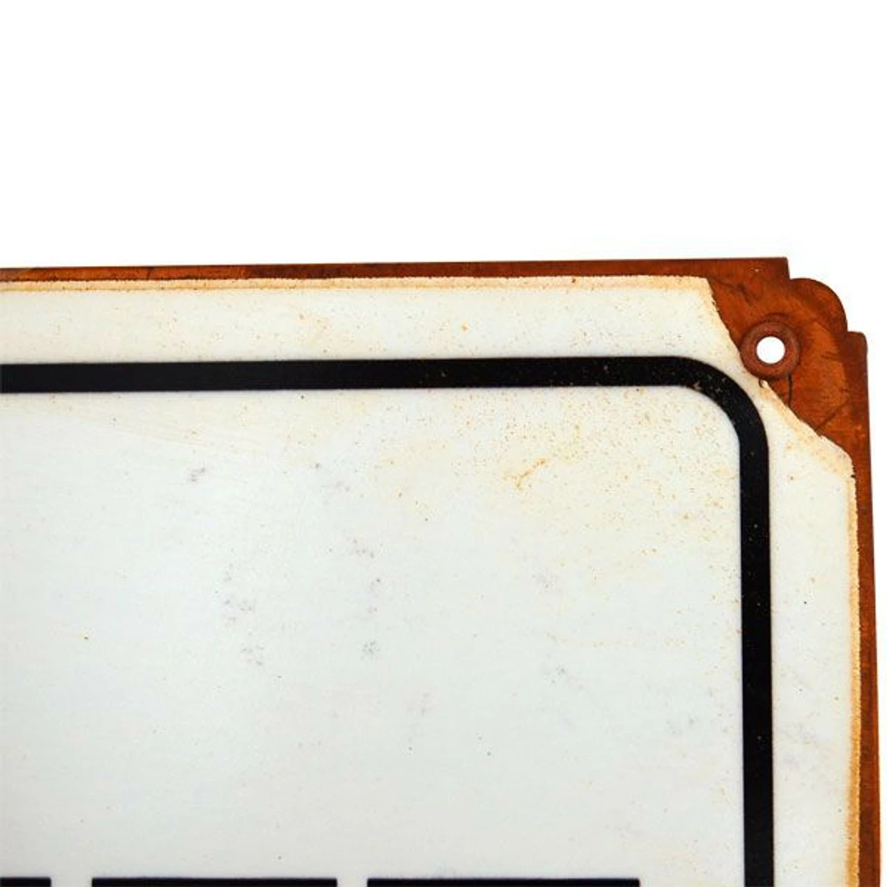 This is a piece from a series of vintage bar signs crafted from 24-gauge American steel. A process called sublimation bakes the image right onto the powder-coated steel and afterward sign makers perform a unique vintaging process by hand to give it an aged look.
