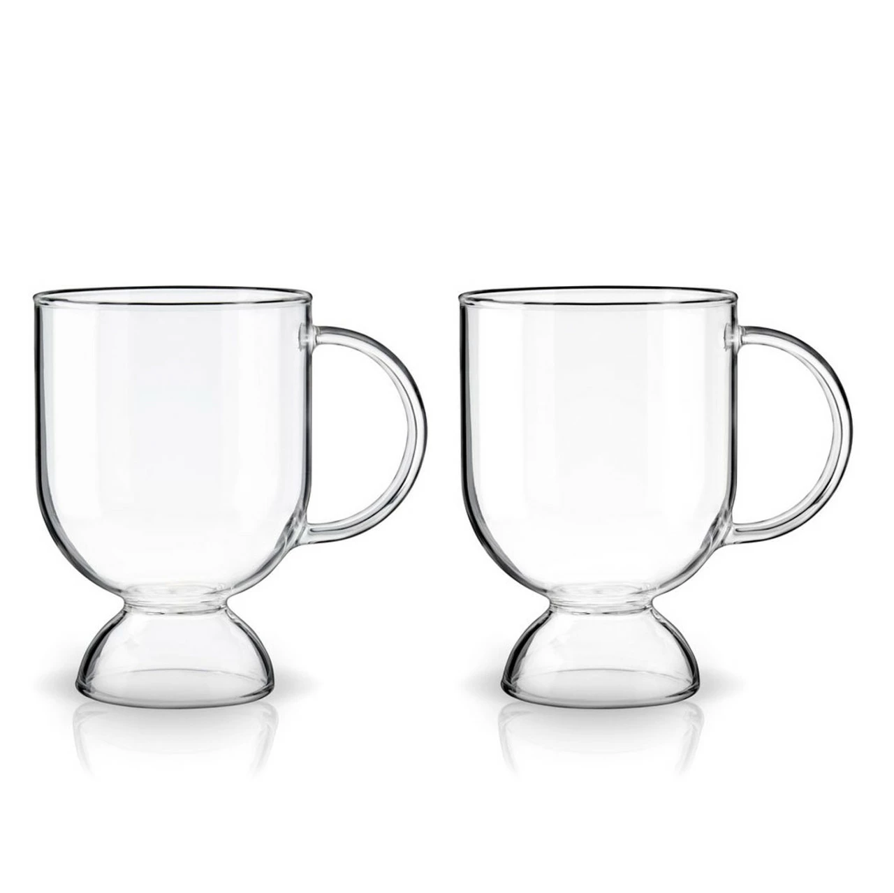 This set of two Viski Hot Toddy Warm Cocktail Footed Glass Mugs sports a modern design with a curved, footed base plus an easy to hold handle that protects your hand. These clear glasses show off the color and texture of your warm beverage of choice and are perfect for layered drinks.