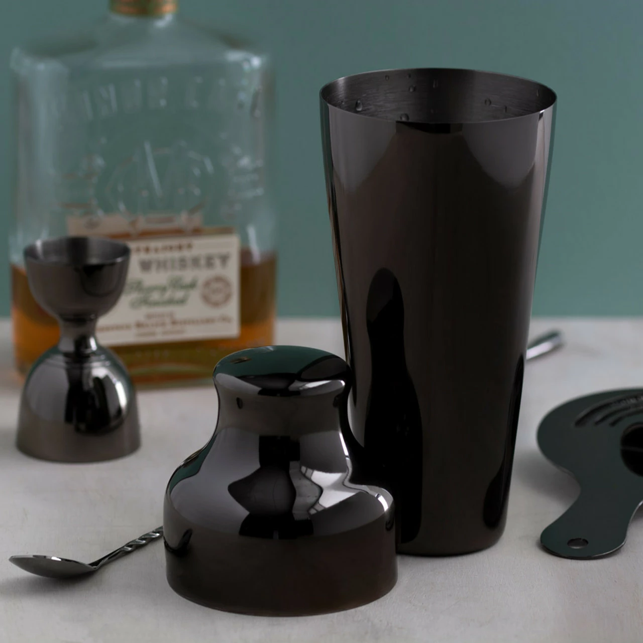 This cocktail shaker set consists of two parts: a metal mixing tin and a lid that fits atop it. Both are made from 304 stainless-steel with the trendy gunmetal black finish. We recommend hand washing only to best maintain the luxurious shine of this exquisite piece over time.