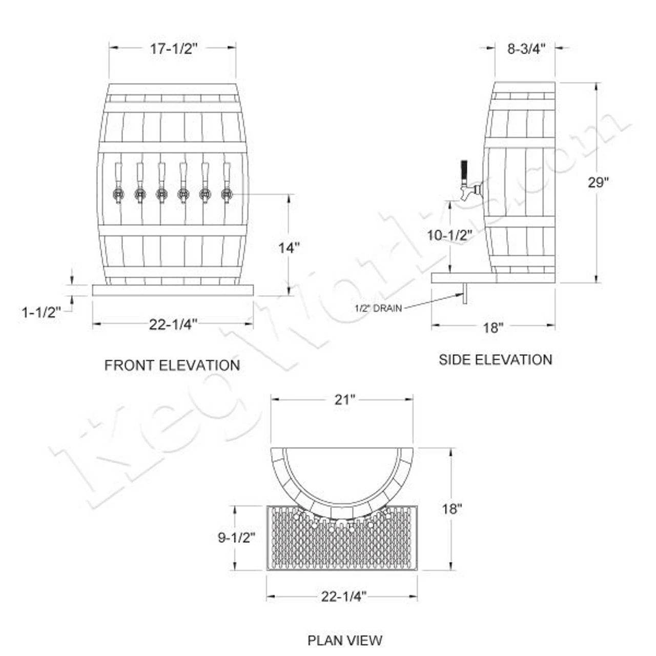 The barrel draft beer tower is constructed of natural, unfinished Oak and comes with a separate, fitted 300 series stainless steel surface mount drip pan with lift-out perforated inserts.